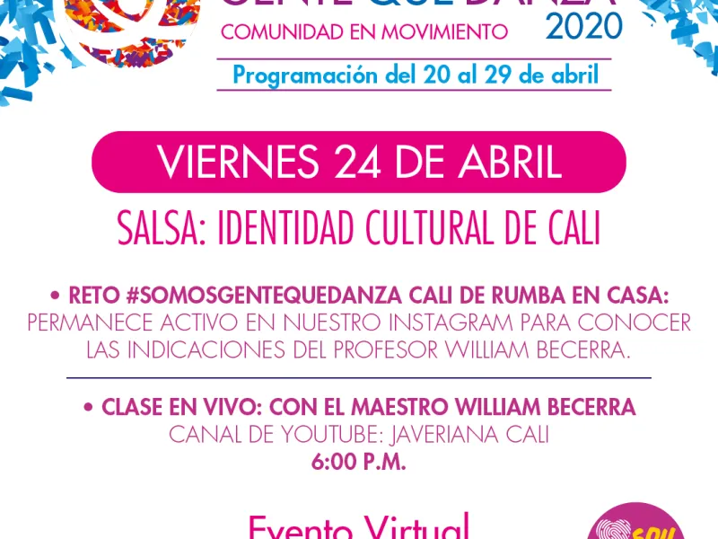 El Centro de Expresión Cultural invita a la Comunidad Javeriana y la ciudadanía en general, al Festival Universitario Gente Que Danza ‘Comunidad en Movimiento´ 2020, que en su sexta versión se desarrollara de forma virtual del 20 al 29 de abril, brindando espacios de conexión humana a través de las redes institucionales de la Vicerrectoría del Medio y de la Pontificia Universidad Javeriana Cali.